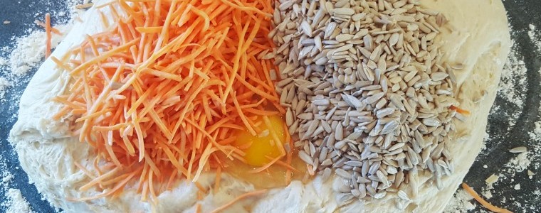 Kom dejen ud på et meldrysset bord, og lav en fordybning i midten. Slå æggene ud i fordybningen og tilsæt revne gulerødder og solsikkekerner.