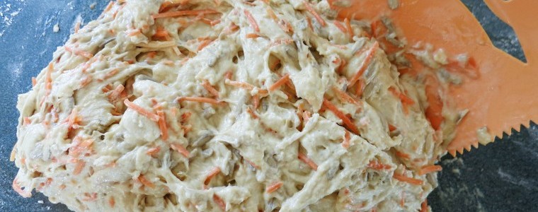 Fold dejen til en stor bolle og brug en kniv til at hakke dejen i stykker. Jeg havde en plastikdims fra Tupperware jeg brugte. Den var rigtig god til jobbet. Sørg for hele tiden at samle æg, gulerødder og solsikkekerner op og ind i dejen.