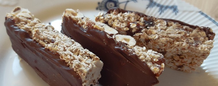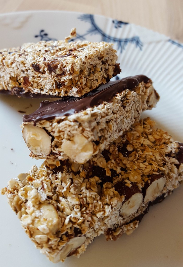 Smelt den mørke chokolade over vandbad og smør/dyp müslibaren i chokoladen så det dækker bunden. Lad det stå og stivne.