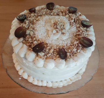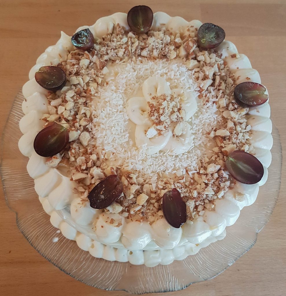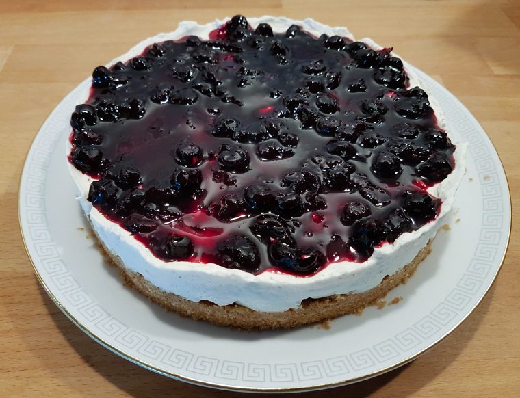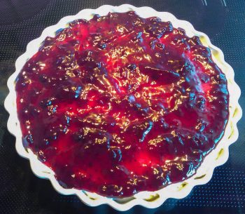Ostemassen kommes henover bunden og kagen stilles på køl til næste dag, hvor der pyntes med solbærsyltetøj lige inden servering.
