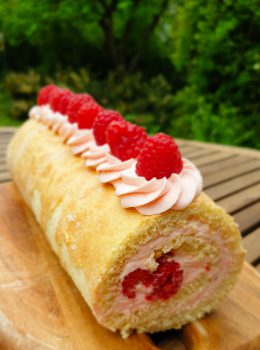 Sprøjt den resterende mousse på toppen af rouladen og pynt med friske hindbær/jordbær.