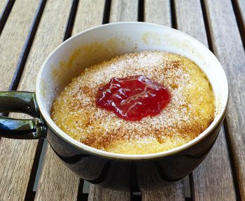 Bag den i mikroovnen i ca. 45 sekunder eller indtil den er fast på toppen. Drys kanelsukker på og pynt med en klat syltetøj og spis med det samme.
