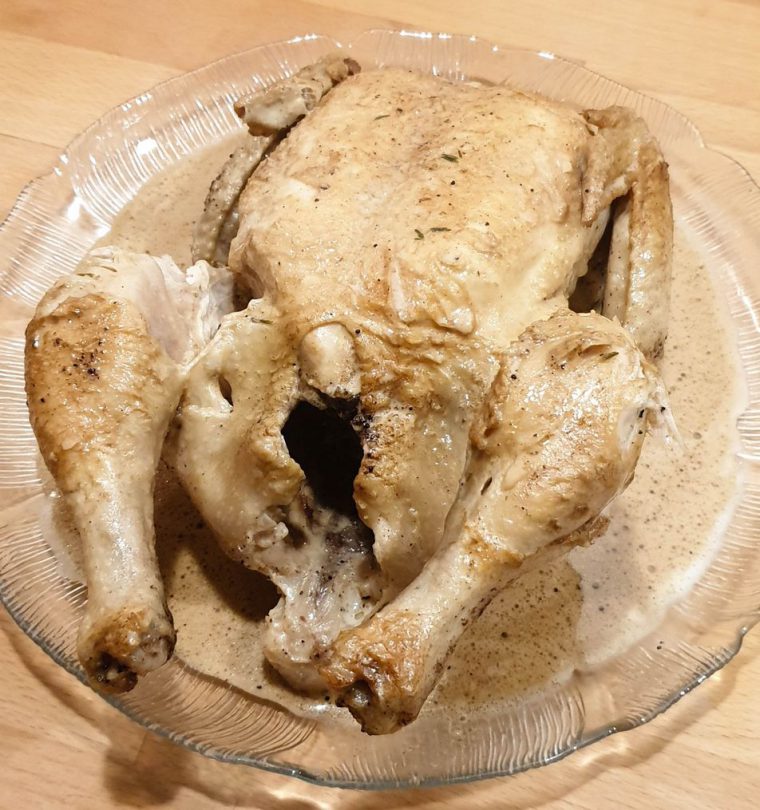 Når kyllingen er brunet godt af, lægges den med brystet nedad i gryden, hvorefter du hælder vand og en bouillonterning i. Læg også nogle kviste timian ved, og krydr kyllingen med friskkværnet peber.