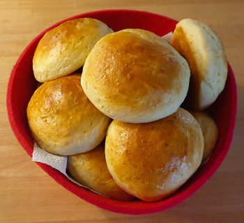 Det er svært at sætte en præcis tid på, hvor længe, brødet skal bage, men regn med en samlet bagetid på ca. 50-60 minutter. Ovne varierer meget i styrke, brødets størrelse og form varierer, og du kan ikke altid stole på ovnens termostat. Derfor er det allerbedste at bruge et digitaltermometer til at finde ud af, om brødet er bagt færdigt.