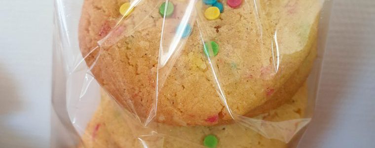 Da jeg var inviteret til en 40-års fødselsdag, ville jeg komme med en kurv, fyldt med masser af gode sager. Så tænkte jeg disse cookies ville passe godt som en del af kurven. De smager dejligt af vanilje, da der blandes et brev kagecremepulver i dejen.