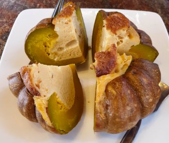 Hæld æggeblandingen inden i græskarret. Fyld ikke helt op til kanten, lad 1-2 cm være, da æggemassen vil hæve sig når den bliver bagt.