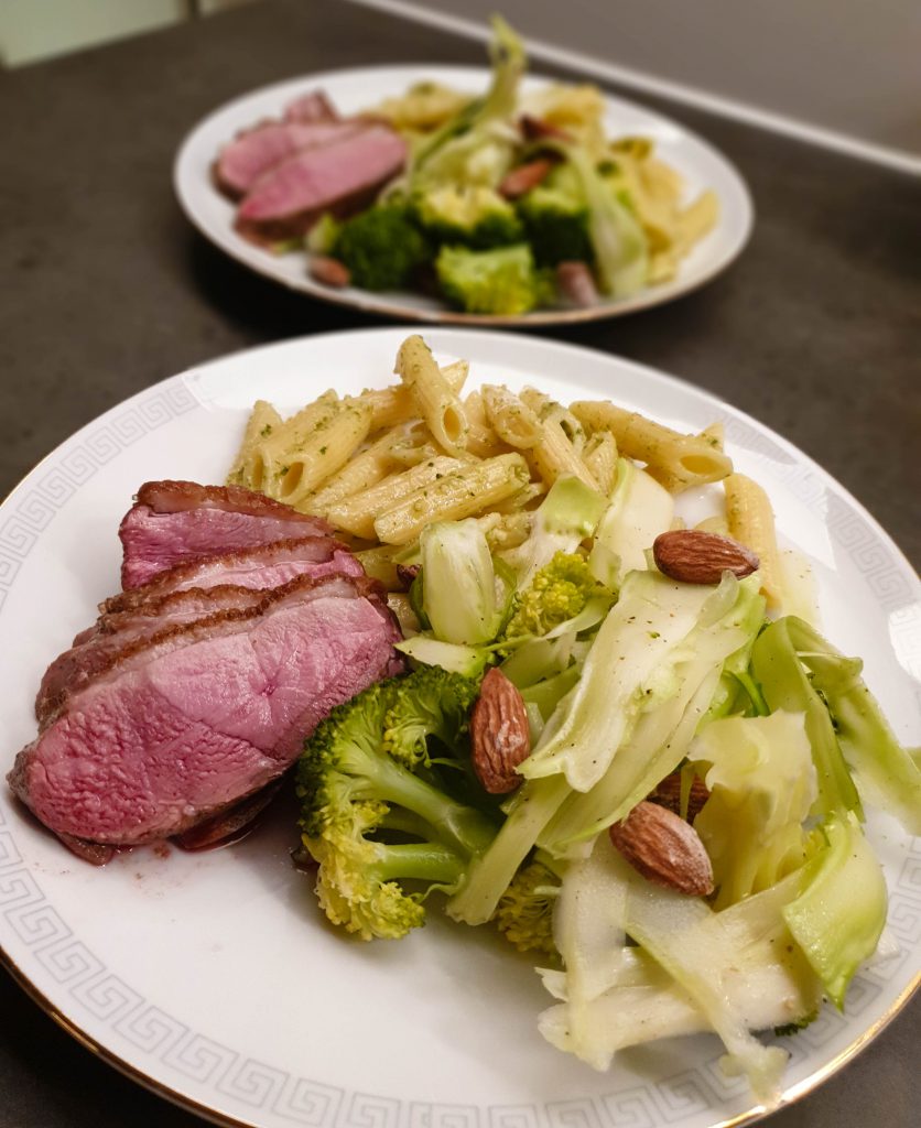 Da jeg havde købt nogle billige andebryst efter julen, ville jeg gerne lave en sund ret med and. Jeg fandt denne opskrift og det blev rigtig godt. Jeg kan godt lide mit andebryst rosa, men hvis du gerne vil have det lidt mindre rosa, skal du bare give det lidt mere tid i ovnen. Ca. 20-25 min.
