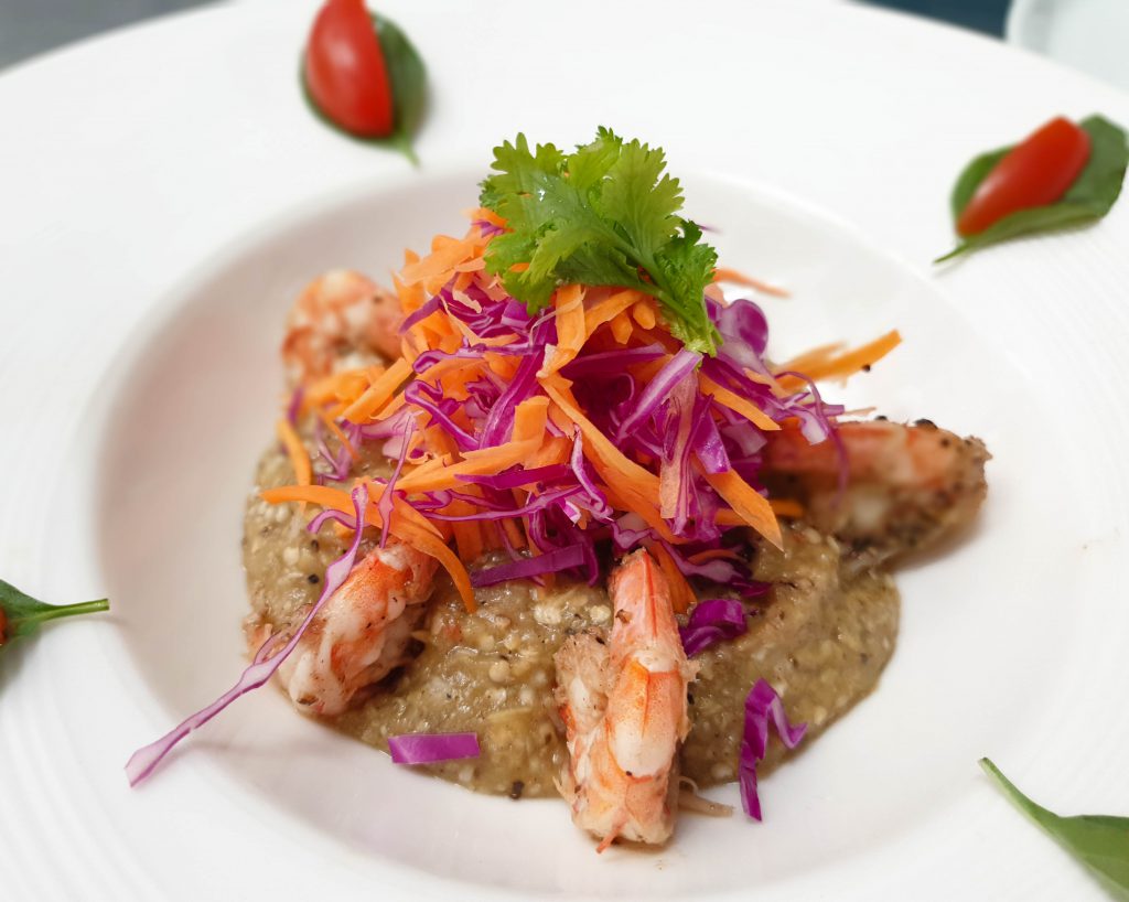 Rør godt rundt. Kom nu auberginemosen tilbage i gryden, hvor stegeolien fra rejerne stadig er. Det giver mosen endnu mere smag. Steg mosen ved middelvarme til noget af væden er fordampet, og mosen er blevet lidt mere fast. Smag til om der mangler mere lime, salt og peber.