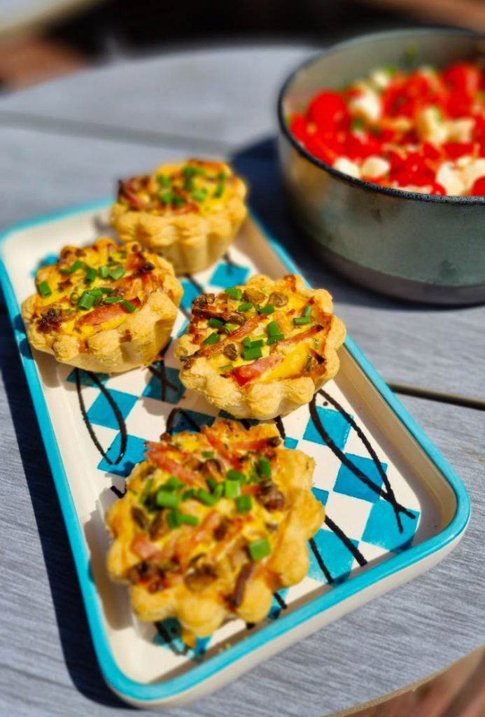Disse bagte tarteletter er en super ide til en nem frokost, en skøn solskinsdag. De er hurtige at lave og så smager de rigtig dejligt.