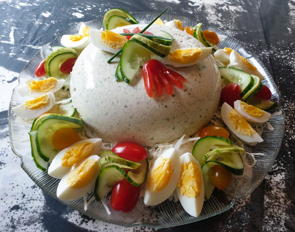 Vend moussen ud på et fad på en bund af snittet grøn salat. Pynt med kogte æg, tomater og agurk og server sammen med et godt brød.