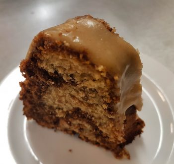 Kom skiftevis de to deje i klatter ned i formen. Fyld den kun 2/3 dele op da den hæver en del. (Hvis du har rester af dej , bag det som cupcakes) Brug en kniv eller en spartel til at lave hvivler i dejen.