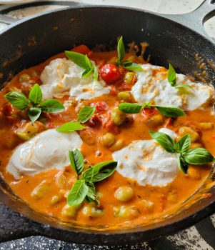 I mellem tiden koger du gnocchien som anvist på pakken. Gem 100 ml af pastavandet. Kom de kogte gnocchi og vandet ned i panden til tomaterne, og rør i retten indtil saucen er tyknet. Det tager ca. 2 minutter.