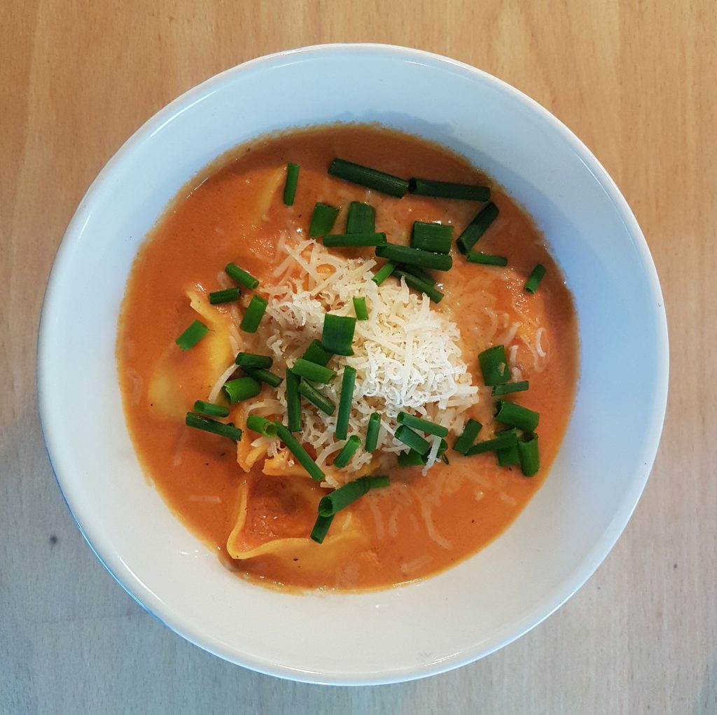 Tilsæt tortellini og kog suppen indtil tortellinierne er færdigkogte.