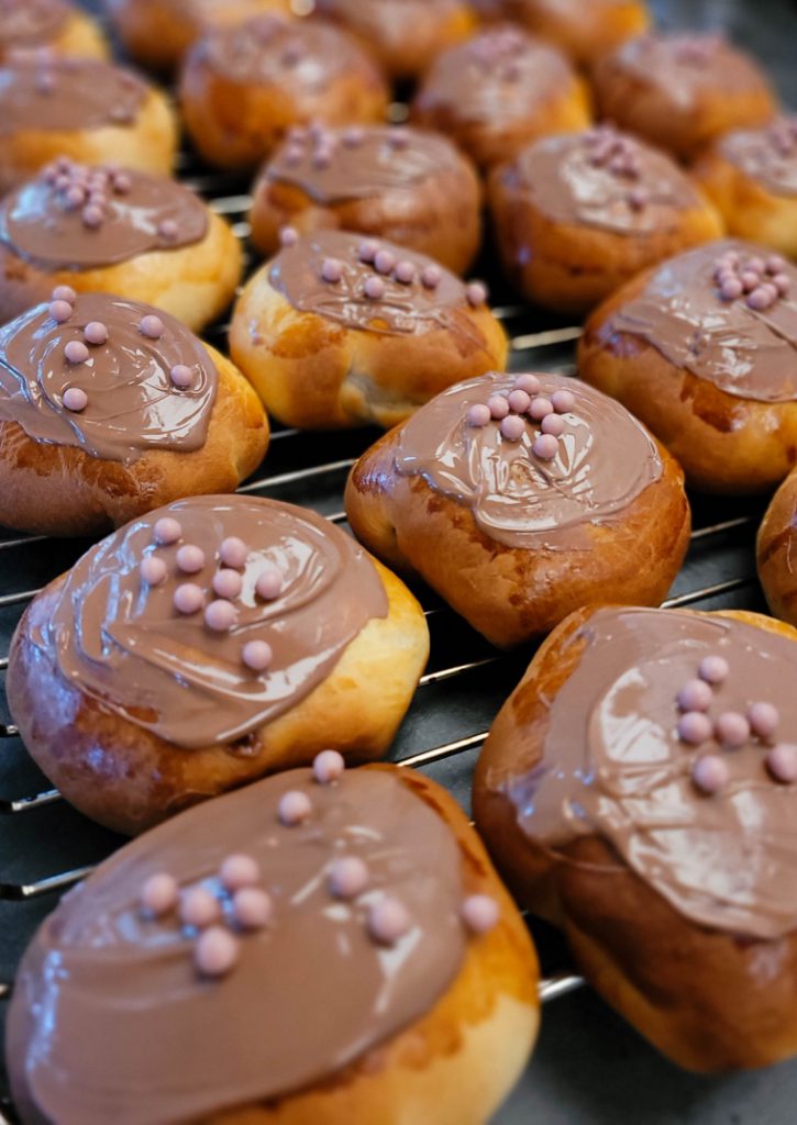 Smelt chokolade over vandbad eller i mikroovnen. Dyp bollerne i chokoladen, eller brug en ske og drys med krymmel. Fastelavnsbollerne er fryseegnede, det er dog en god ide at vente med at overtrække dem til de skal spises.