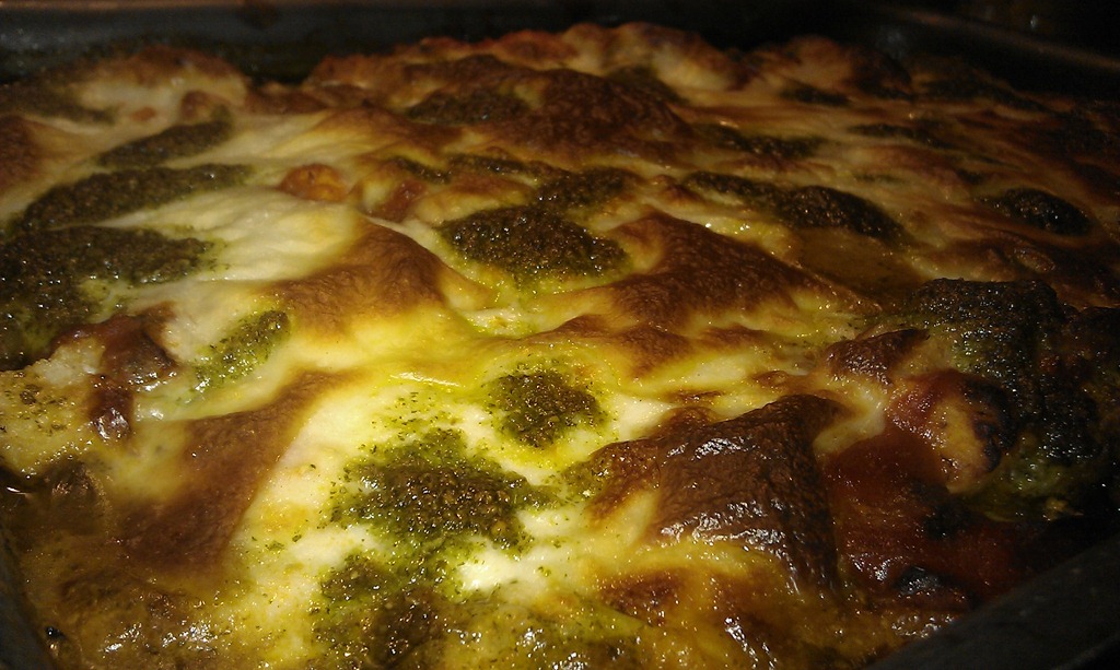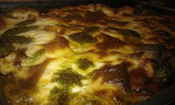 Nu skal fiskelasagnen samles. Sæt ovnen til 200-220 grader. Tag et godt lasagnefad – et rektangulært ovnfast fad med høje kanter er det bedste. Skær fisken ud i strimler på størrelse med en langefinger. Start med et lag fisk. Giv så nogle skefulde tomatsauce udover, og nogle klatter hist og pist af pesto. Så kommes et lag auberginer på – og sådan fortsætter man. Slut af med tomatsovs – og kom tilsidst bechamel-saucen ovenpå. Evt. lidt pesto. Sæt fadet i ovnen og giv lasagnen en 25-30 minutter. Hold øje med den. Når overfladen er gylden og gratineret og boblende, er den klar. Giv den eventuelt lige et par minutter udenfor ovnen, inden den serveres. Lasagnen skal være ret våd, men ikke på nogen måder flydende.