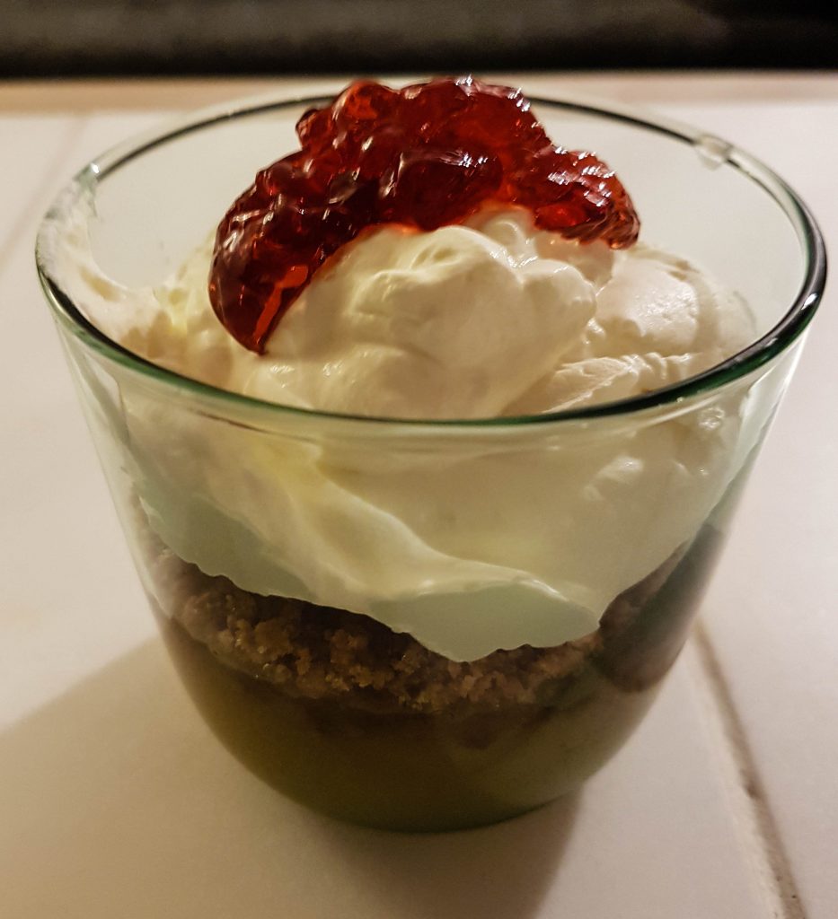 Kom ribsgelé i klatter ovenpå flødeskummet.