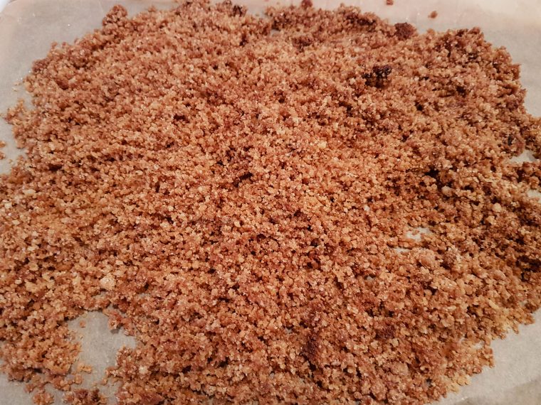 Tag raspen af panden, når den er gyldenbrun. Fordel raspen på et stykke bagepapir, og lad den køle af. Rør med en gaffel undervejs, så den ikke stivner i en stor, hård klump.
