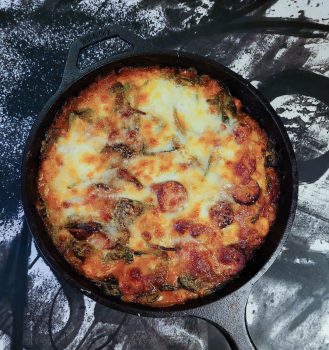 Kom mozzarella og parmesan på toppen og kom hele panden i ovnen, og bag i 17-20 minutter.