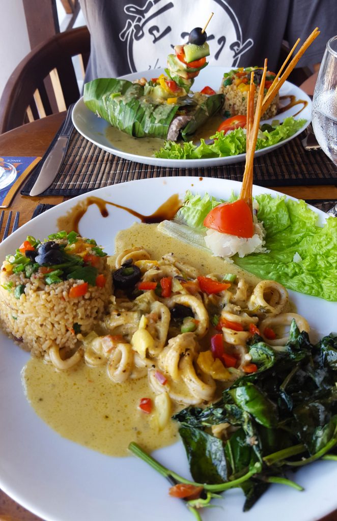De kan bare noget med smage her på Sri Lanka. Min mand siger at den dampede tun i bananblad var det bedste stykke tun han nogen sinde havde fået. Og min blæksprutte var også super lækker. Deres mad kan også være noget krydret som da vi fik fiske curry og dhal curry. Men ikke noget vi ikke kunne spise efter 2 måneder i Thailand hvor de gerne krydre deres mad med chili.