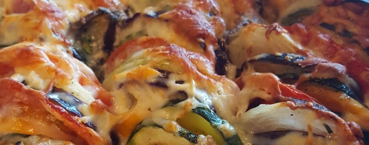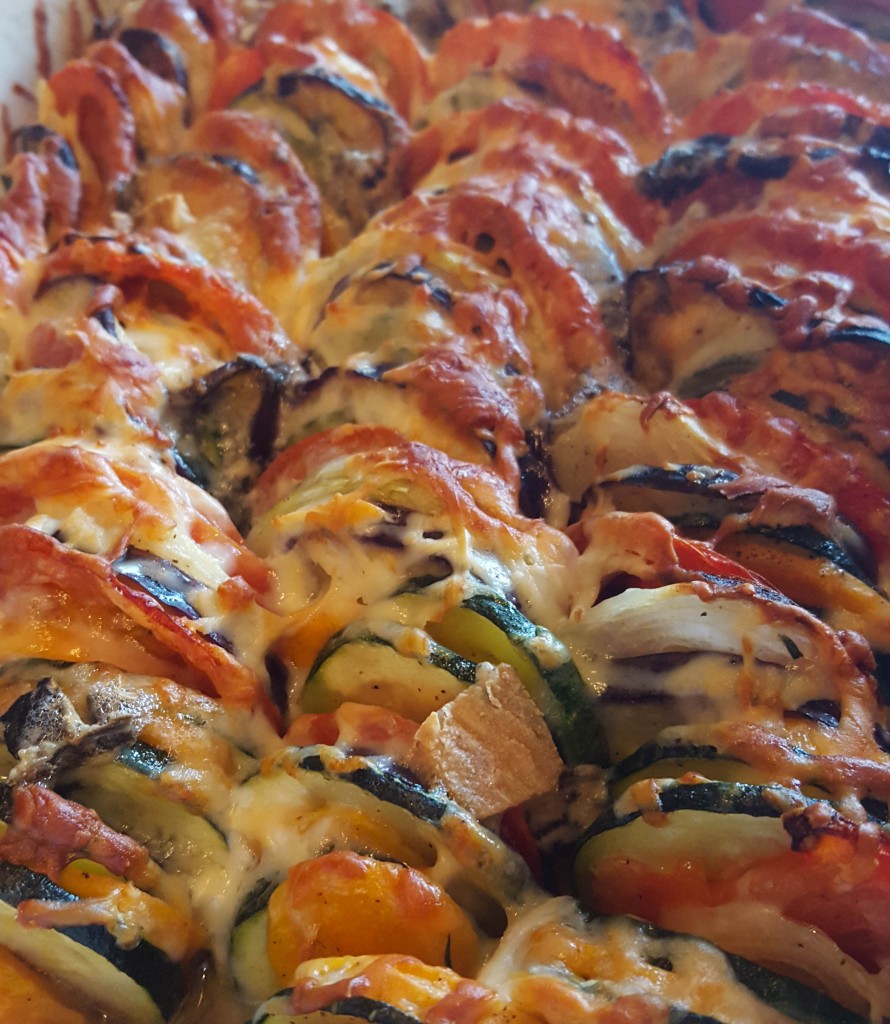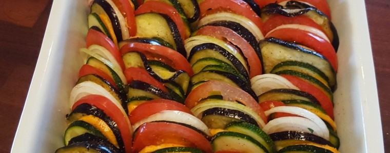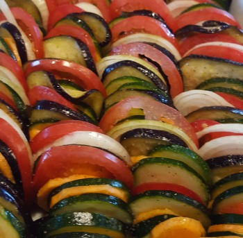 Skær alle grønsagerne ud i tynde skiver, dog ikke papirstynde. Vend grønsagerne med olie, salt og peber. Stabel grønsagerne så de stå opret i fadet. Stil dem skiftevis så det giver et godt spil i farverne.