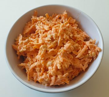 Put de revne gulerødder i en skål og bland dem sammen med yoghurten, peanuts og krydderierne.