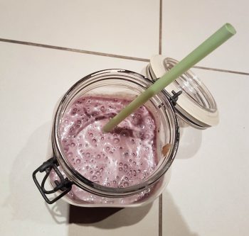 Opskriften var med frisk fersken, men er jo ikke helt nemt at få fat på hele året. Du kan bruge det frugt du er mest glad for, eller lige har liggende hjemme. Jeg har brugt 1 banan og lidt hindbær. Men smager dejligt med mange andre frugter. Bananen er dog med til at give lidt mere naturlig sødme til drikken.