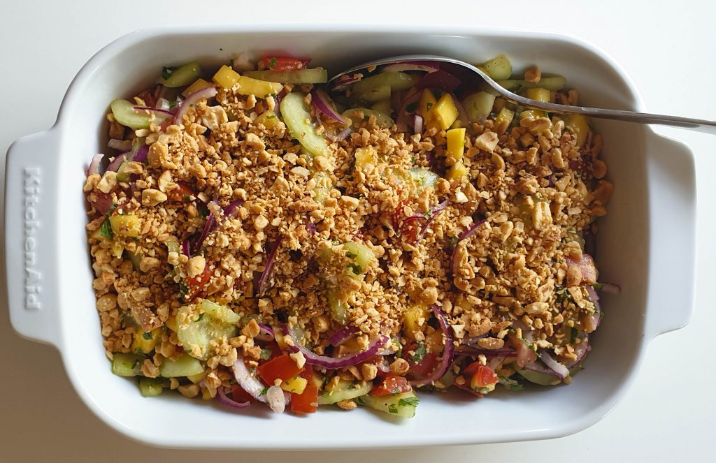 Når jeg laver indisk mad er der ikke ret tit en frisk salat med. Det synes jeg gerne mangler og denne er super frisk og giver et godt modspil til de ret fyldige indiske retter.