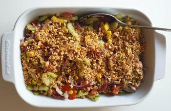 Bland agurk, tomattern, mangotern og rødløg i en skål.