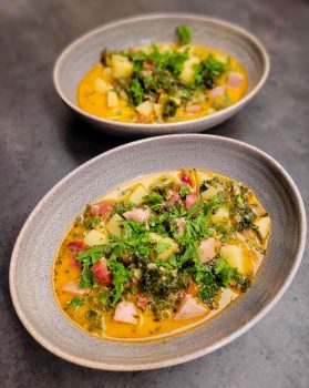 Jeg havde en rest grønkål som jeg skulle have brugt. Så fandt jeg en opskrift på en skøn suppe hos Valdemarsro som jeg tænkte jeg måtte prøve. Da jeg havde alle ingredienserne hjemme i køleskabet, var det bare at komme i gang.