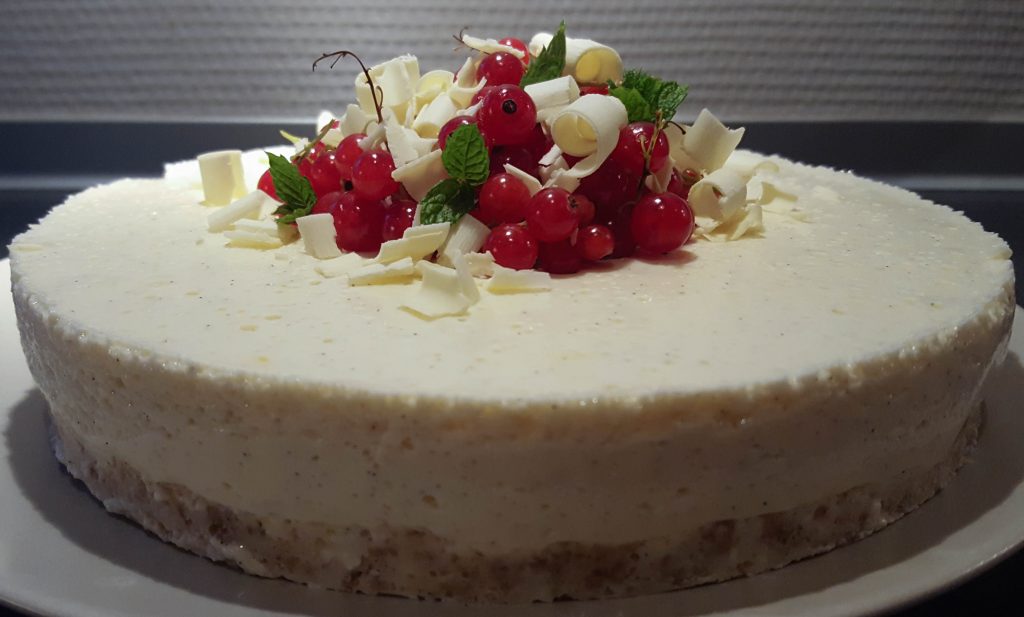 Før servering pyntes kagen med bær. Jeg brugte friske ribs, mynteblade og revet hvid chokolade.