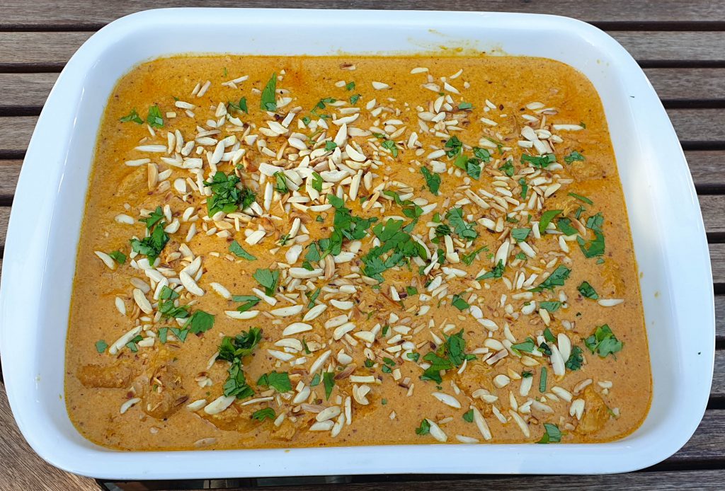 Pynt med ristede mandelflager og koriander på toppen og server med ris og naanbrød.