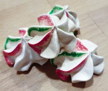 Jeg har kommet lidt pastafarve i striber ned i sprøjteposen, inden marengsen kommes i, det giver en flot effekt. Du kan også farve hele massen, ved at piske list pastafarve i sammen med essensen.