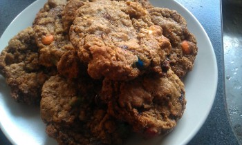 Bland forsigtigt natron, havregryn og mel i. Bland det hele sammen, det må ikke blandes for meget. Vend forsigtigt m&m’s i.`