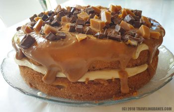Inden servering kommes karamellen (dulce de leche) ud over kagen. (Du kan evt. give karamellen et par sekunder i mikroovnen, for at gøre det mere flydende, hvis den er for stiv).