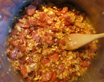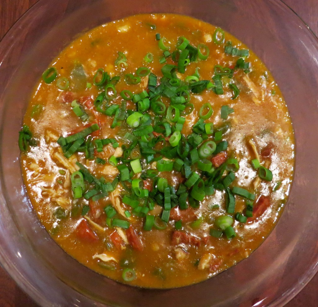 Varm svinefedtet og kom mel i. Rør i det hele tiden. Det skal ende med at ligne Peanut butter I farven og også blive lidt grynet. Kom chorizo I og steg lidt. Kom løg, blegselleri og grøn peber i. Kom hvidløg i, og lad det stege til grønsager er blevet bløde. Rør i det ofte. Tilsæt hønsebouillon og lad det komme op og koge. Skru ned, og lad det simre i en time eller mere. Smag til med Joe’s Stuff seasoning. Ca. 10 min før servering tilføj kylling og de hakkede forårsløg.