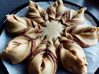 Dette gøres nu med alle 8 vingepar. Du ender så ud med en kage der har et stjerne mønster af nutella skiftevis med dej.
