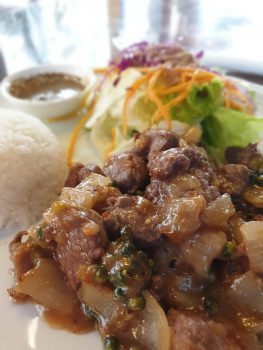 Det er en super simpel ret lavet med rigtig gode råvarer, som blev en af Michaels favoritretter i Cambodia. Så da vi fik muligheden for at vælge den på det madlavningskursus vi tog i Kampot, var det et nemt valg. Denne ret er virkelig nem og hurtig at lave, bare sørg for at have noget rigtig godt oksekød, som kan tilberedes på få minutter. Skær en god bøf ud i strimler eller brug evt. oksemørbrad.