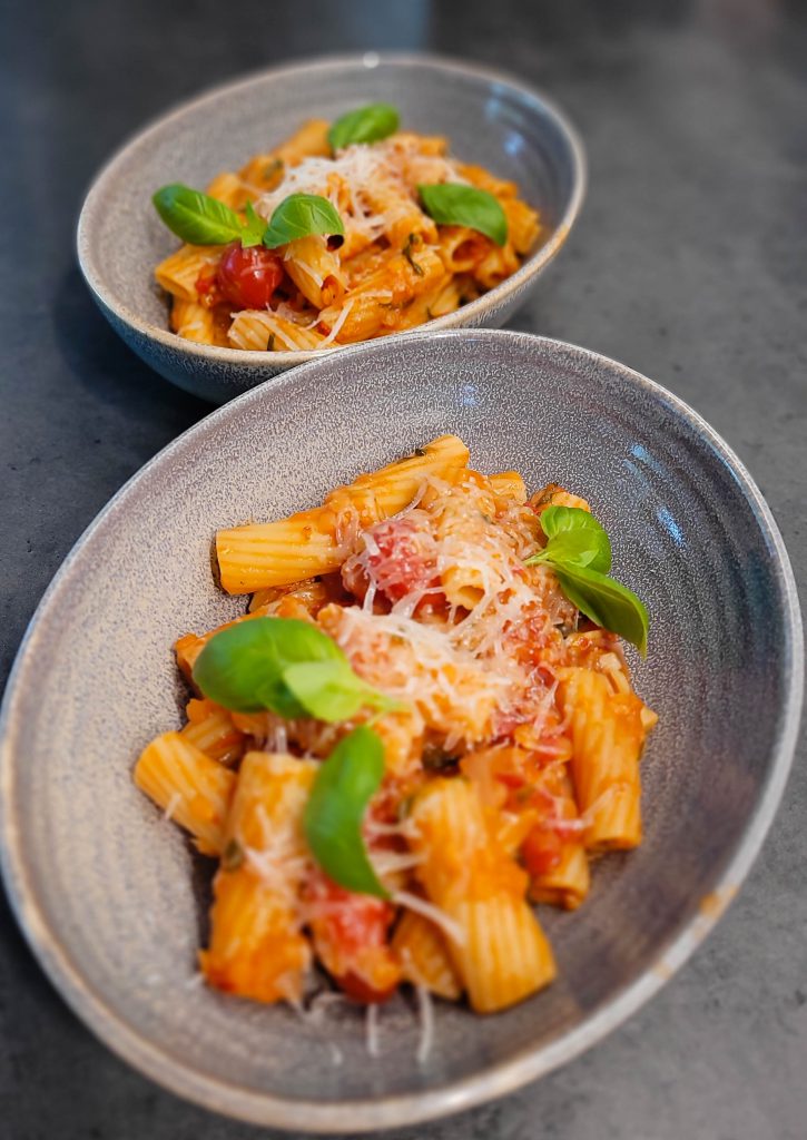 Tag 2 dl pastavand fra og kom den i tomatsaucen. Afdryp pastaen i et dørslag.