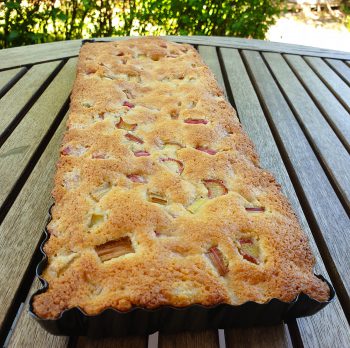Kom dejen i et smurt fad og top kagen med de sidste rabarbere, så de ligger fint synligt på toppen.