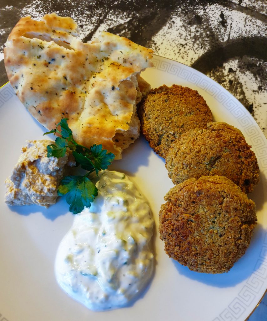 Jeg serverede disse falafler med hjemmelavet hummus og tzatziki og et godt brød.