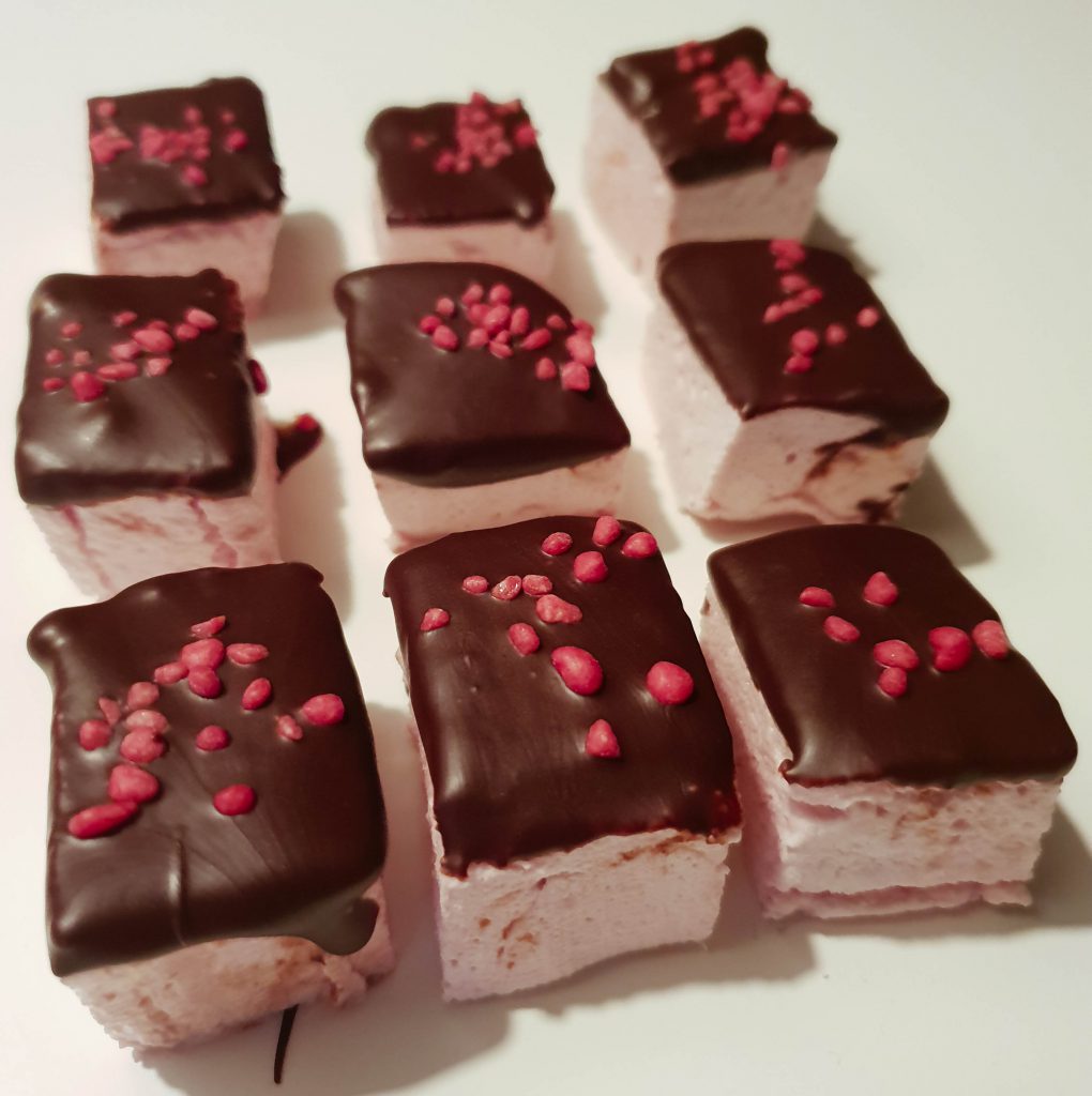 Disse bløde skumfiduser med hindbær er en lækker lille konfekt her i juletiden. Hjemmelavet juleskum, men her ved du hvad der er i, så man kan give det til børnene med lidt bedre samvittighed.