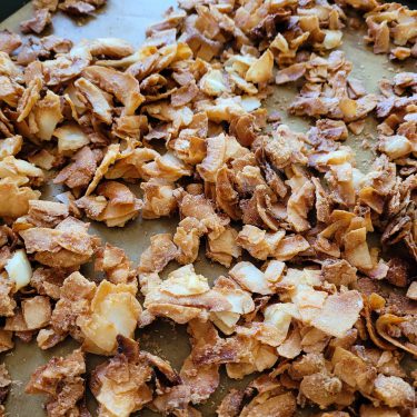 Disse skønne kokos flager bliver super sprøde og lækre af at blive karamelliseret i ovnen. Brug dem som drys i din mysli.