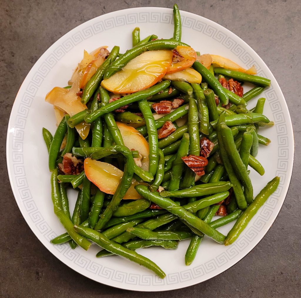 Jeg serverede confiteret andelår til mortensaften. Et godt tilbehør til and er disse bønner.