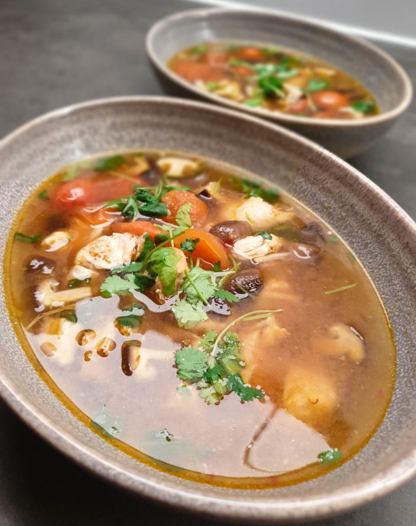 Denne sunde thaisuppe er rigtig nem at lave. Hvis du vil lave den helt vegansk, undlader du bare kyllingen. Kunne jeg sagtens selv finde på, men det tillader manden ikke, da han er inkarneret kødspiser.