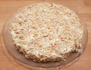 Der skal bruges de fine mandelflager i opskriften, men jeg kunne kun finde mandelsplitter i mit supermarked, og synes kagen blev flot, så brug hvad du kan få fat i.