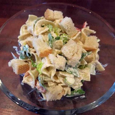 Denne pastasalat er en mere fyldig udgave af en caesar salad. Skøn at bruge som tilbehør til sommerens grillaftener, eller som en skøn hovedret med kyllingestykker i.