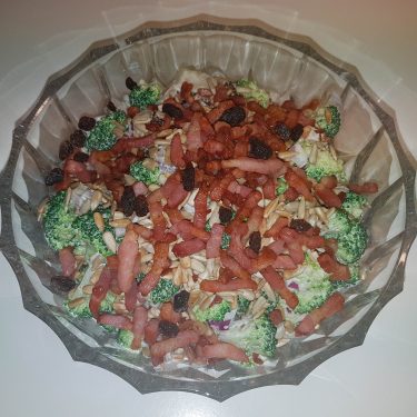 Broccolisalat er en salat de fleste kan lide. Den lidt søde dressing og det salte bacon går godt sammen med denne grøntsag. Og så passer det til alt slags kød.
