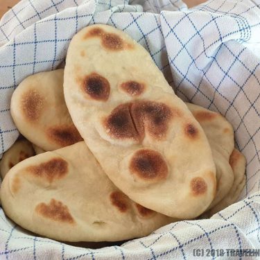 Disse brød er bagt på en pande, så de kan få den skønne stegeskorpe som der er på rigtige naan brød. Det er også et plus, hvis man står et sted uden ovn.