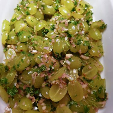 Da vi har vindruer i drivhuset, og der kommer så mange at vi ikke kan nå at spise dem alle, faldt jeg over denne opskrift. Den er fundet i det madmargasin der hedder Good Food. Rigtig nem at gå til, og en god måde at få brugt sine druer på.