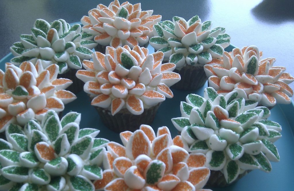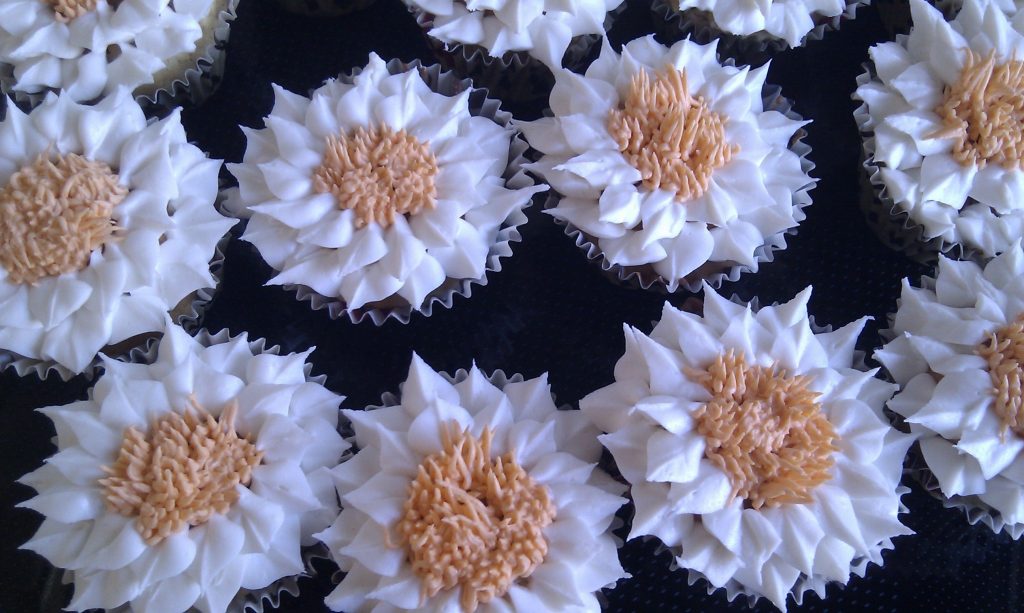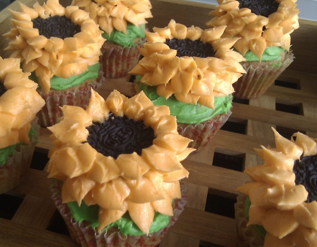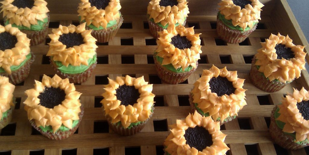 Denne opskrift på vanilje cupcakes er en jeg har haft liggende længe. Elsker at bage cupcakes og pynte dem, men er nok blevet grebet af at pynte store kager i stedet for, så der bliver ikke lavet helt så mange cupcakes. Jeg synes disse solsikker er rigtig fine, og kunne være festlige på påskebordet med deres gule farve. Jeg har også lavet dem som marguritter. Bladene er lavet med en bladtyl og midten i maguritterne er lavet med en græstyl.
